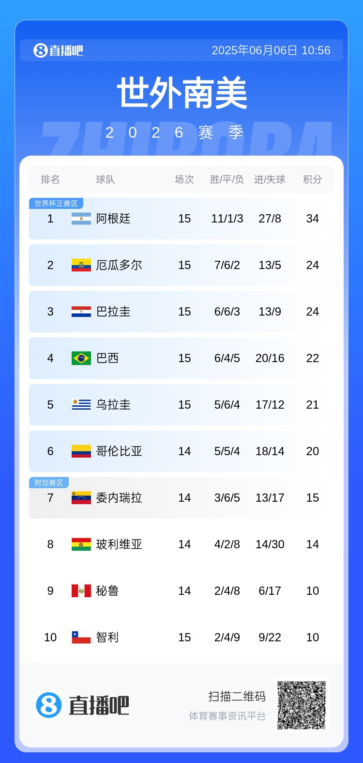 在15轮过后,巴拉圭战绩为6胜6平3负,进13球丢9球,拿到24个积分。即将直通2026年美加墨世界杯。